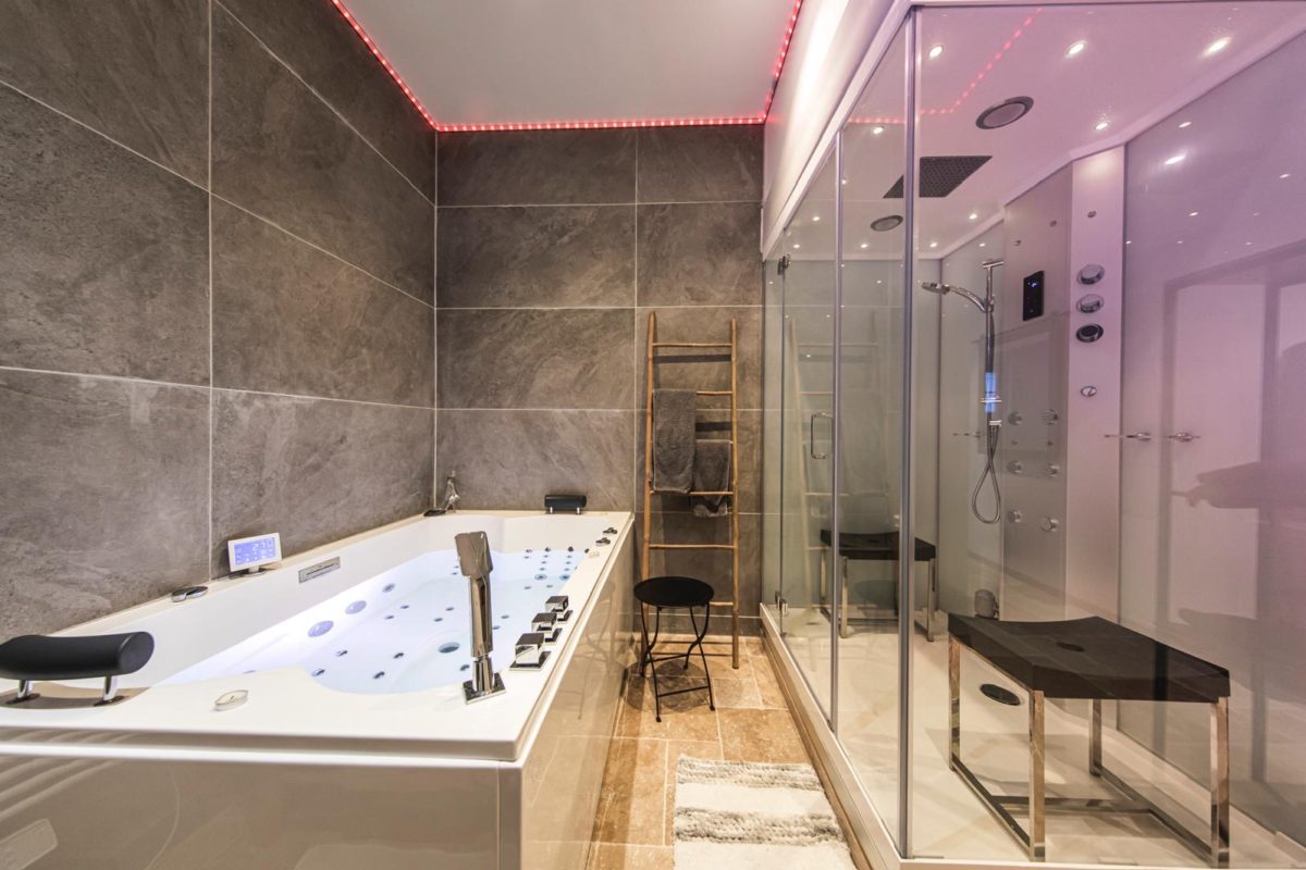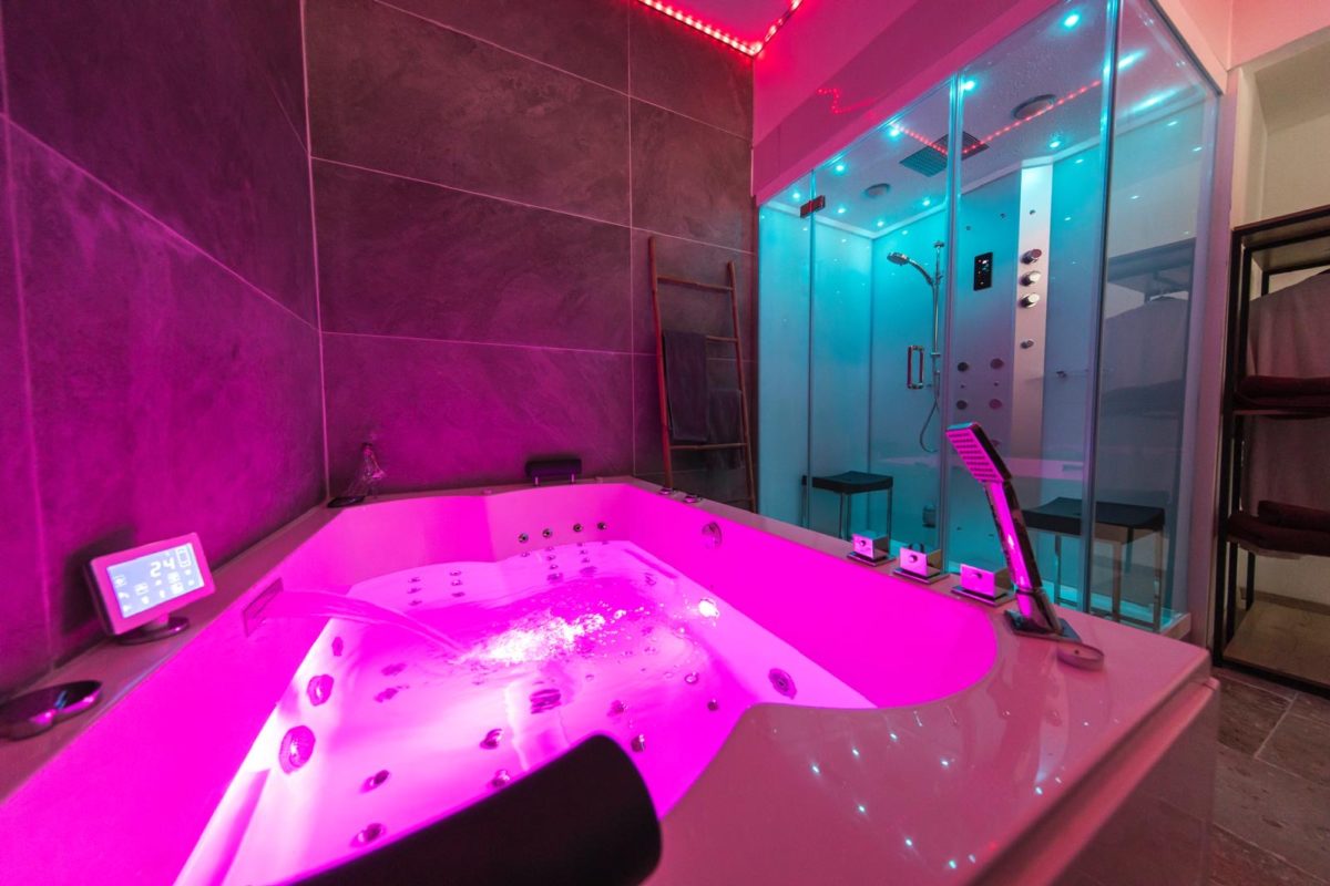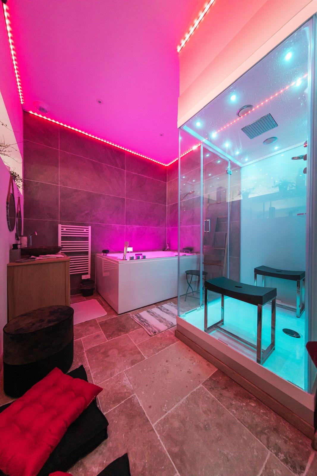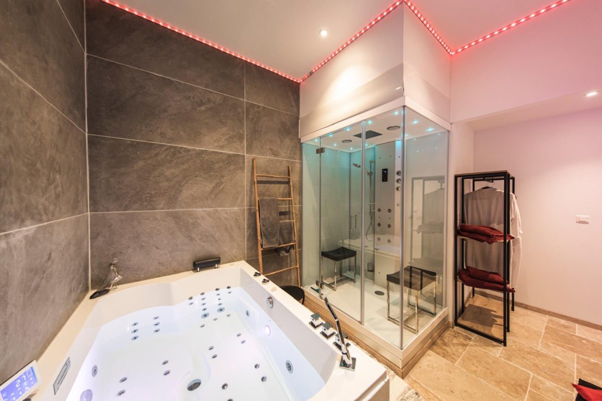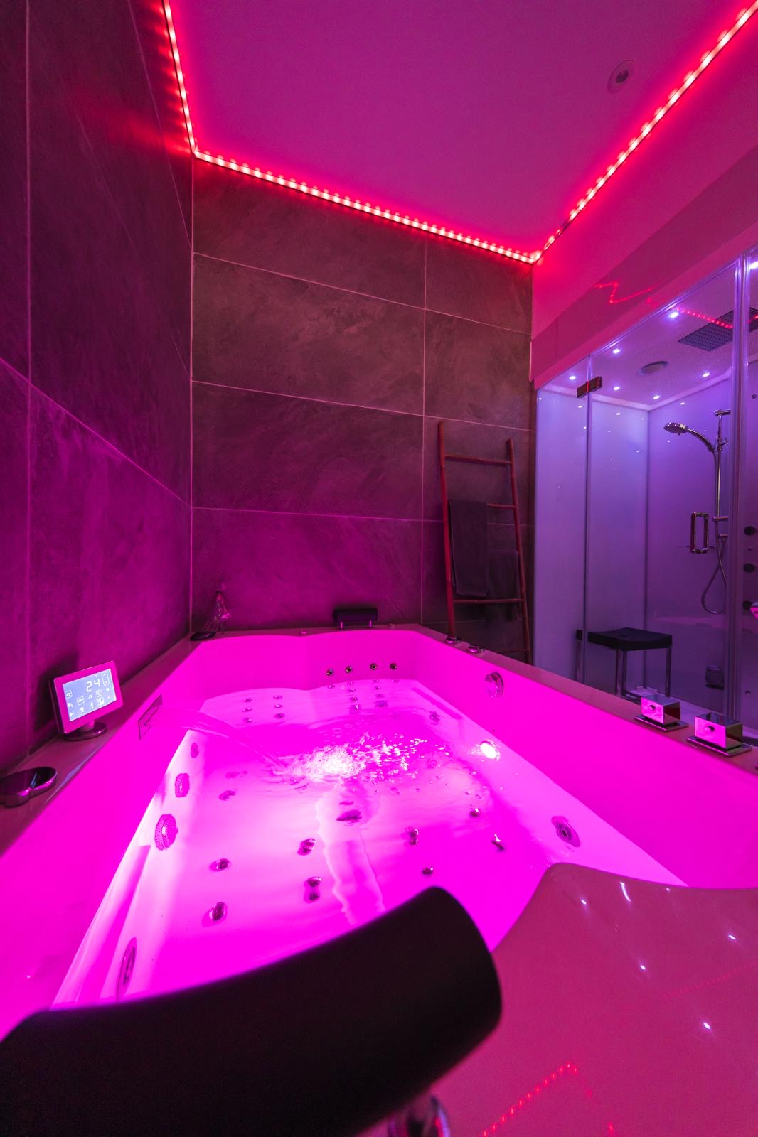 _ Une baignoire jaccuzi 2 places, plus de 40 jets puissants dorsaux, chromothérapie avec 65 leds, musique